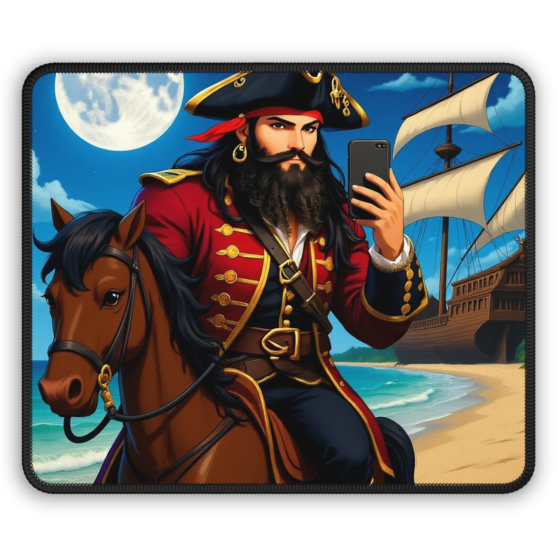 Blackbeard is the most famouse pirate of the Carolinas! Humorous gaming mousepad shows Blackbeard riding horseback and sending a selfie after being shipwrecked. This is the perfect Gaming Mouse Pad. The enchanting imagery of a pirate captures the essence of adventure and fantasy, making it a perfect addition to any gaming setup. With its vibrant colors and intricate design, this mouse pad adds a touch of magic to your desk. Ideal for gamers, students, and anyone who loves unique and artistic decor. Perfect for birthdays, holidays, or just to treat yourself! Immerse yourself in your favorite games with this functional and eye-catching accessory.